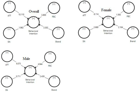 For hypothesis 1, for overall student data, female and male students, the results reveal that attitude has a positive effect on the intention to purchase halal cosmetics, thus, supporting H1a (β = 0.444, p ≤ 0.01), H1b (β = 0.461, p ≤ 0.01), and H1c (β = 0.403, p ≤ 0.01). For hypothesis 2, overall students (β = 0.087, p ≤ 0.05) and female students (β = 0.149, p ≤ 0.01), the results reveal that subjective norms have a positive effect on these two groups’ intention to purchase halal cosmetics. Conversely, for male students (β = −0.035, p = 0.262), the analysis reveals that subjective norms have no effect on their intention to purchase halal cosmetics. Thus, the results demonstrate that H2a and H2b were supported, whereas H2c was unsupported. For hypothesis 3, the results show that PBC has a positive effect on the overall student group (β = 0.145, p ≤ 0.01) and on male students (β = 0.327, p ≤ 0.01), thus supporting H3a and H3c. However, the results also demonstrate that PBC has no effect on the intention to purchase halal cosmetics for female students; thus, H3b of the study is unsupported. For the last direct hypothesis, all groups of data confirmed that brand image has a positive effect on the intention to purchase halal cosmetics, thus supporting H4a (β = 0.137, p ≤ 0.01), H4b (β = 0.443, p ≤ 0.01), and H4c (β = 0.184, p ≤ 0.01).