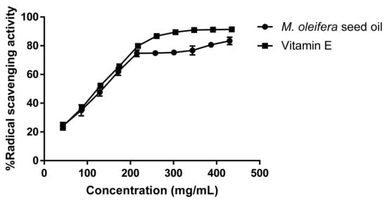 Percentage of the radical scavenging activity of M. oleifera seed oil and Vitamin E measured using the 2,2-diphenyl-1-picrylhydrazyl (DPPH) method. The results are the mean ± S.D. of three experiments. Moringa seed oil was mixed with 500 μM DPPH in absolute ethanol and incubated in the dark at room temperature for 30 min. After incubation, the absorbance was measured at 517 nm using a UV-visible microplate reader. Gallic acid in absolute ethanol and vitamin E were used as positive controls, and absolute ethanol was used as a negative control.