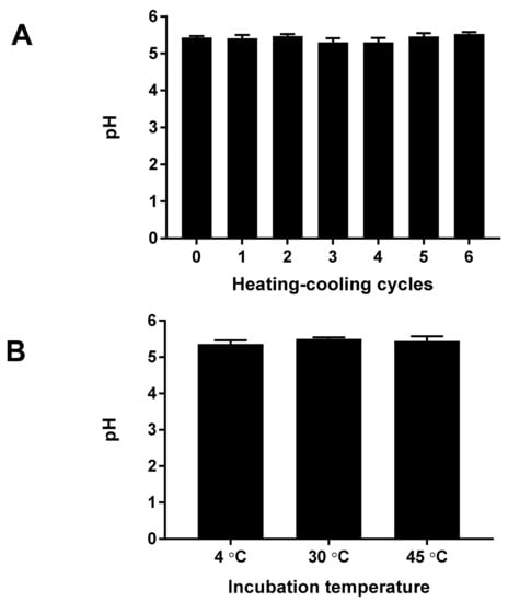 (A) Effect of thermal cycling on the pH of cream containing M. oleifera seed oil. (B) Effect of storage temperature on the pH of the cream containing M. oleifera seed oil. The results are the mean ± SD of three experiments. The physical stability of the M. oleifera oil cream was studied with a heating–cooling cycle method for six cycles. Samples of cream containing M. oleifera oil were stored in glass containers for 24 h in a refrigerator and were placed in an incubator at 45 °C for another 24 h, accounting for one cycle. The long-term stability of the M. oleifera seed oil cream was investigated by storage of the cream at 4, 30, and 45 °C for 28 days. The pH of the cream was measured using a Mettler Toledo Electrode.
