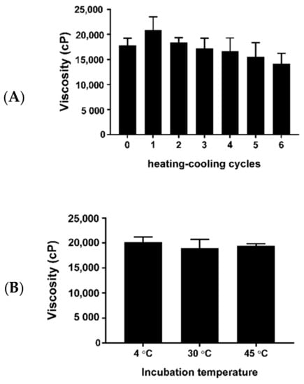 The long-term stability of M. oleifera seed oil cream was investigated by storage of the cream at 4, 30, and 45 °C for 28 days []. The appearance, color, odor, and homogeneity of M. oleifera oil cream after the stability studies were observed by visualization. The pH and viscosity were measured at the end of each cycle and long-term storage. The rheological characteristics of the moringa seed oil cream were characterized by a rheometer (HAAKE™, Thermo Scientific, Dreieich, Germany).