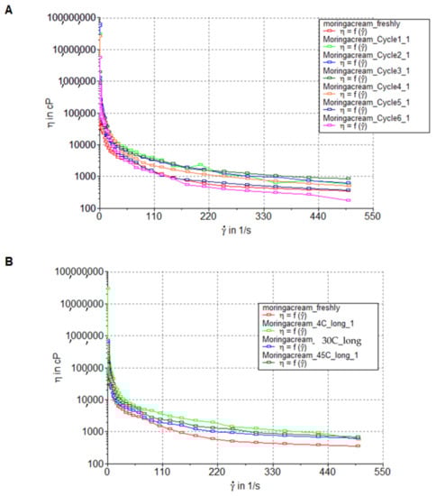 The viscosity of M. oleifera cream was not changed after passing each heating–cooling cycle of stability testing and 28 day-storage at 4, 30, and 45 °C as shown in Figure 4. The rheograms of the M. oleifera cream after the heating–cooling stability study (Figure 5A) and 28-day stability study (Figure 5B) suggests a pseudoplastic flow of the cream. The rheological behaviors of the cream after fresh preparation and stability testing showed a pseudoplastic flow indicating the physical stability of the cream.