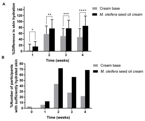 (A) Percentage of difference in the skin hydration of subjects who applied M. oleifera seed oil cream and the cream base. (B) Percentage of the number of subjects with sufficiently hydrated skin after application of the M. oleifera seed oil cream and cream base. The results are the mean ± SD of three measurements (n = 32). The skin hydration test was performed using a Corneometer®. After washing the arm at the sample application sites, the subjects were kept in a room with controlled temperature (25 °C) and relative humidity (40–60%). All measurements were performed in triplicate. * p<0.05, ** p<0.01, *** p <0.001, and **** p <0.0001 vs. cream base.