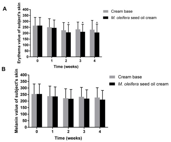 The average erythema value measured by Mexameter® was statistically reduced after 2, 3, and 4 weeks of moringa seed oil cream application (Figure 7A). The melanin values after the application of moringa seed oil cream and the cream base were not significantly different from the baseline, suggesting that moringa seed oil cream and the cream base did not have whitening/brightening effects (Figure 7B).