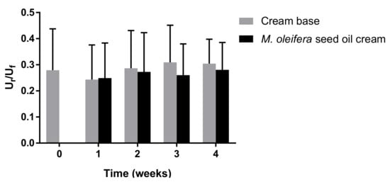 The value of Ur/Uf represented the immediate recovery of the skin with normal pressure after skin deformation []. The resistance of the skin to the negative pressure represented the firmness, and the skin’s ability to return into the original state represented elasticity. Ur/Uf represents the elasticity of the skin and its ability to recover its original position. The results showed that there was no significant change in the Ur/Uf values after applying either moringa seed oil cream or the cream base when compared with the baseline (Figure 8). We concluded that the application of moringa seed oil and cream base for 4 weeks did not alter the skin elasticity.