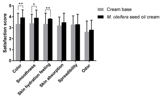 The subjects’ satisfaction regarding various attributes of the moringa seed oil cream and the cream base. The results are the mean ± SD of three measurements (n = 32). The satisfaction regarding the cream containing M. oleifera seed oil was measured by means of a questionnaire. Healthy volunteers reported the consumer acceptability scores on a 5-point hedonic scale (scale 1: extremely dislike, scale 2: slightly dislike, scale 3: neither like nor dislike, scale 4: slightly like, and scale 5: extremely like) after using a blinded cream base or M. oleifera seed oil cream. Participants evaluated their satisfaction with the color, smoothness, skin hydration feeling, skin absorption, spreadability, and odor. * p<0.05, ** p<0.01 vs. cream base.