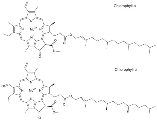 Structural formula of chlorophyll. Top: Chlorophyll a. Bottom: Chlorophyll b.