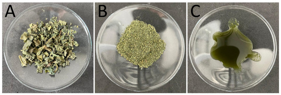 Macroscopic images of the samples. (A): Coarse stinging nettle leaves (bulk). (B): Dry milled powder (coffee mill (CM)). (C): PlantCrystals suspension (high-pressure homogenization (HPH)).