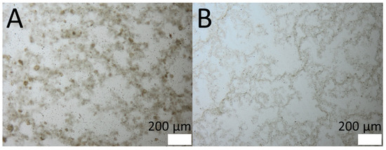 The production of PlantCrystals from coarse SN leaf bulk material was successful. HPH resulted in very small particles, and no intact cells were observed via light microscopy. A distinct differentiation of the samples processed without additional stabilization (Figure 3A) and TPGS (Figure 3B) as surfactant could not visually be observed after light microscopic examination. Only a slightly lower tendency of agglomeration could be perceived for the sample with TPGS as a surfactant.