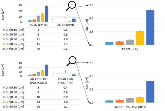 The numeric size distribution analysis showed again that the swollen sample included slightly bigger sizes for the samples without surfactant compared to samples containing TPGS (Figure 5). The processed sample possessed similar sizes for lower D-values (D(n)0.10 and D(n)0.50), and large differences could be recognized for higher D-values (D(n)0.95 to D(n)0.99).