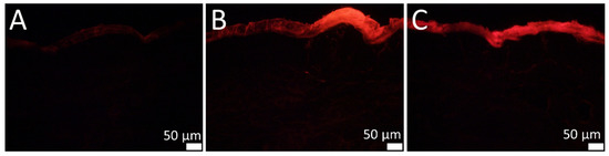 Fluorescence microscopic images. Magnification: 200-fold. (A): Untreated skin. (B): Skin treated with SN bulk material. (C): Skin treated with SN PlantCrystals stabilized with TPGS.