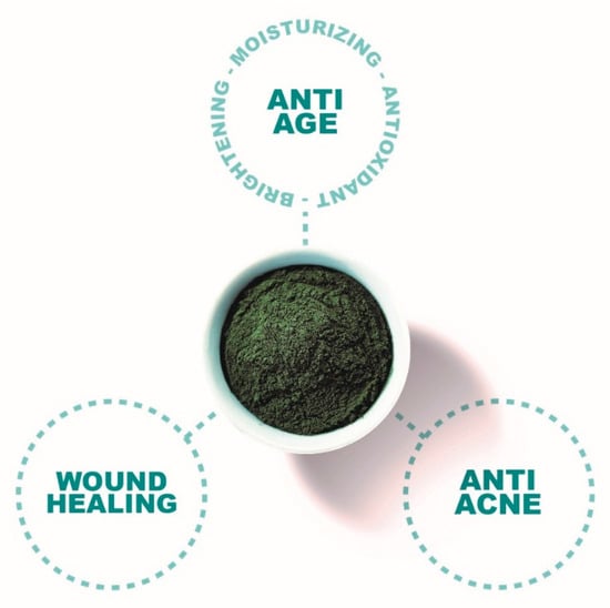 These features make this alga an attractive new ingredient, especially for the formulation of green and ecofriendly cosmetics [23]. In this context, a recent trend is using Spirulina food supplements as “nutricosmetics” that not only help to prevent diseases and become healthier, but also they enhance the natural beauty of skin, nails and hair [24,25,26].