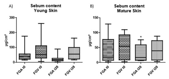Sebum content of the skin before (t0), and after 28 days (t28) of application of the formulations FGA (gel cream containing 0.1% of Spirulina extract) and FGV (gel cream without Spirulina extract) on young skin (18–39 years) (A) and mature skin (40–65 years) (B) (* Kruskal–Wallis, p < 0.05). Published by ref. [30].