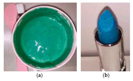 The antioxidant potential of blue-colored cyanobacteria is of great interest in the cosmesis. Pigments can be used as natural colorants in make-up products, like eyeliner and lipstick, and as antioxidant agents, which protect against UV radiation [1,23]. Indeed, Spirulina contains a lot of photosynthetic pigments like chlorophyll and especially phycocyanin, which determine a long-lasting green-blue coloration in cosmetic formulas (Figure 4) [47].
