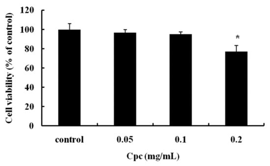 Effect of C-phycocyanin (Cpc) on B16F10 murine melanoma cell viability. The asterisk (*) indicates a significant difference from control group (*, p < 0.05). Published by Ref. [35].