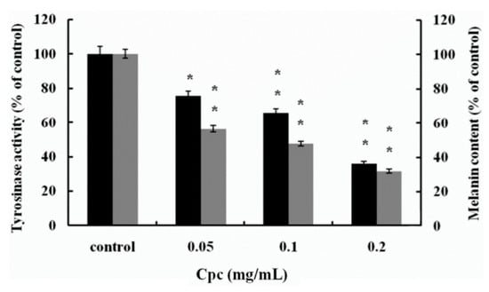 Effect of C-phycocyanin (Cpc) on tyrosinase activity (black) and melanin content (grey). The asterisk (*) has been used to denote a significant difference from control group (*, p < 0.05; **, p < 0.01). Published by Ref. [35].