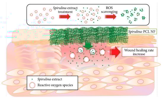 More recently a Korean research team absorbed Spirulina in an engineered-tissue, to evaluate its wound healing potential [40,41]. They selected nanofibers of polycaprolactone (PCL) as a supporting material suitable for tissue regeneration. PCL, which is an FDA-approved polymer, is also biocompatible, biodegradable and known to favor the oxygen absorptivity, the drainage capability and the water evaporative control, which are critical factors for the skin regeneration. In a study, Spirulina aqueous extract was absorbed on the nanomaterial and the wound regeneration was evaluated using an in vivo wound model [40]. In this specific regard and from a bioethical view, we contest such use of an animal for analysis in the cosmetic field and we strongly recommend the stakeholders to find other cruelty free alternatives to perform efficiency tests. In general, Spirulina-PCL helped to regenerate wounds and enhanced skin regeneration, by improving the antioxidant mechanism against the reactive oxygen species (ROS) of fibroblast under oxidative stress (Figure 7). Nevertheless, the developed nanofibers had a restricted capability to moisturize wounded skin because of the hydrophobicity of PCL.