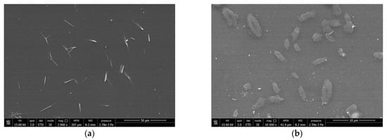 Through the FESEM analysis, CN appeared as almost straight fibrils having a nanometric thickness and a micrometric length (Figure 1a). The spray-dried complex CN-LG showed a completely different morphology, consisting in micrometric disks having a round or ellipsoidal shape (Figure 1b). These disks consist of agglomerated chitin nanofibrils and lignin nanoparticles [24]. During their preparation in diluted water solution, the slightly positive chitin nanofibrils are complexed with slightly negative nanolignin, hence these discoidal complexes including several nanofibrils and lignin nanoparticles are formed and they are able to entrap molecules that may be present in the solution, like Vitamin E, niacinamide or glycyrrhetic acid [24].