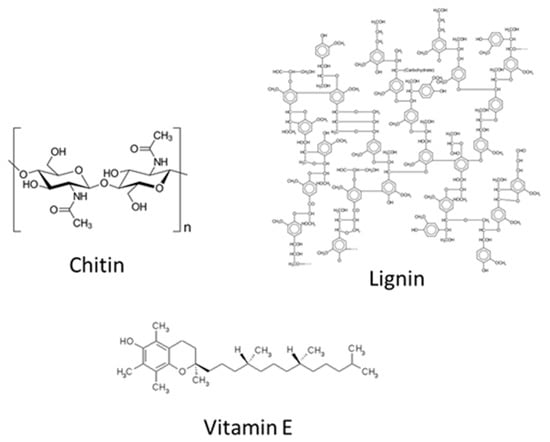Chitin is a polysaccharide, whereas lignin has an aromatic structure. Vitamin E is a lipophilic molecule including a phenolic ring and an aliphatic 16 carbon atoms chain (Figure 2).