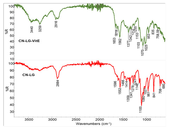 ATR spectra of chitin nanofibrils–nanolignin–Vitamin E complex (CN-LG-Vit-E) and chitin nanofibrils–nanolignin complex (CN-LG).