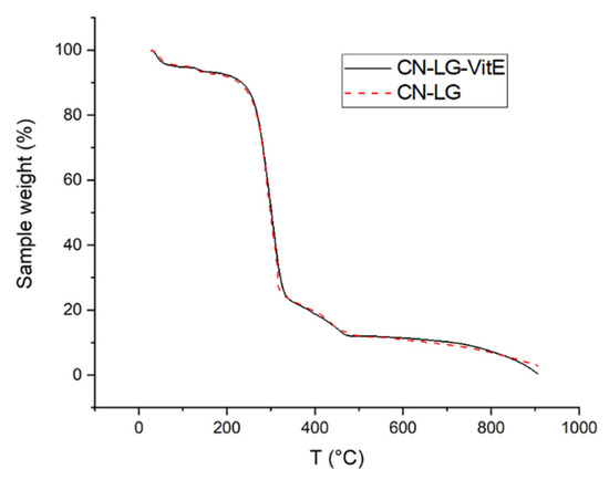 TGA thermograms of chitin nanofibrils–nanolignin–Vitamin E complex (CN-LG-Vit-E) and chitin nanofibrils–nanolignin complex (CN-LG).