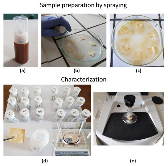 Pictures related to: (a) water-based suspension containing CN-LG-Vit-E, (b) application of CN-LG-Vit-E onto the films, (c) films after the CN-LG-Vit-E application, (d) water extraction, drying and weight of samples and (e) ATR-infrared analysis of dried films.