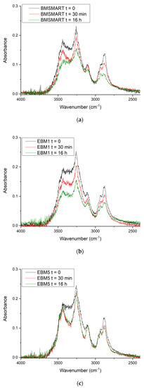 Interestingly, by normalizing on the carbonyl band of biopolyesters (not extractable by water), we could observe that the characteristic bands of starch, at 3250 cm−1, attributable to -OH stretching, decreased after 30 min and 16 h, initiating the release of the starch from the films. Similar results were observed for the uncoated substrates, characterized with an identical methodology [18,19]. A similar trend was observed for BMSMART- and EBM1-coated films, whereas, in the case of EBM5, a less evident decrease in bands’ intensity was noticed (Figure 6c).