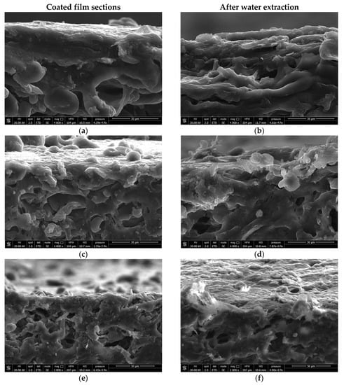FESEM micrographs of the cryo-fractured films consisting of: (a) coated BMSMART, (b) coated BMSMART after water extraction, (c) coated EBM1, (d) coated EBM1 after water extraction, (e) coated EBM5 and (f) coated EBM5 after water extraction.