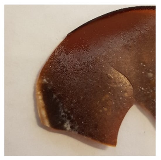 The use of FESEM on cryo-fractured films, before and after extraction in water for 16 h, allowed to analyze the film and surface morphology. The BMSMART film showed a complex morphology, where the starch granules in the film bulk could be noticed (Figure 7a). The surface resulted homogenous (Figure 7a), in agreement with a good film-ability of CN and other particles on the surface. In fact, the deposition of a CN suspension by casting on a glass surface allow to produce films (Figure 8).