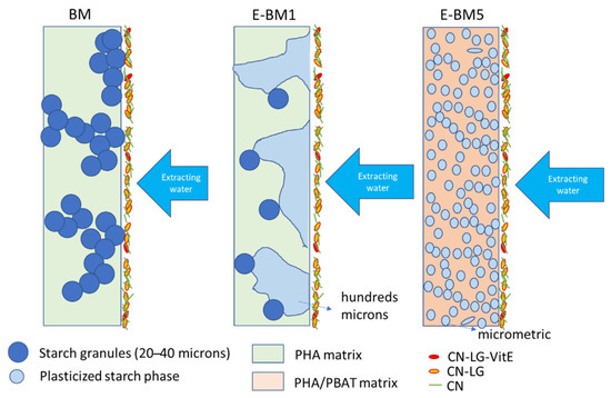 Successively, for optimizing the extrusion by decreasing the melt viscosity, half the PHA was replaced with PBAT, and thus the EBM5 film was produced [19]. This specific film showed the most homogeneous morphology consisting of a matrix of biopolyesters and dispersed micrometric particles of plasticized starch. The latter film showed the lowest capability for releasing starch. The different morphologies of the three formulations are schematized in Figure 9.