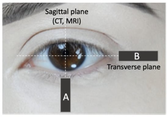 Measurement sites of orbicularis oculi muscle thickness. One study [] measured the muscle thickness of the lower eyelid (sagittal plane site-A), while another study [] measured the outside of the eye—the center of the upper and lower eyelids (transverse plane site-B).
