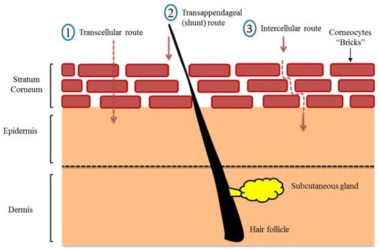 Three main passive routes were identified for drug penetration into the human skin (Figure 2). These are the transcellular (intracellular) pathway, the shunt pathway via hair follicles and sweat glands, and the intercellular pathway [30]. Although the intracellular route appears to be the shortest, it requires crossing through tightly confluent corneocytes and successive partitioning into intercellular lipid bilayers, which slows the penetration of hydrophobic actives through this route. The shunt pathway was thought to be a minor contributor to drug absorption, as the skin appendages only occupy 0.1% of the total human skin. However, it has recently been shown that this route is a potential (significant) transport for a variety of compounds ranging from charged molecules to nanomaterial [31,32,33]. In this regard, most topically applied hydrophilic and amphiphilic actives permeate across the skin via intercellular (tortuous) route, i.e., via the lipid matrix [10,26,34,35]. Changing the lipid composition of human epidermis has shown to dramatically increases water diffusion through human skin [36,37]. After the active release from the formulation and partition into SC, it diffuses via lipid matrix and reaches an interface where it passively undergoes partition from SC lipid into aqueous viable epidermis followed by diffusion through viable epidermis and hydrophilic dermis at the DEJ. Then the active compound can be absorbed into systemic circulation via a dermal capillary network [38].