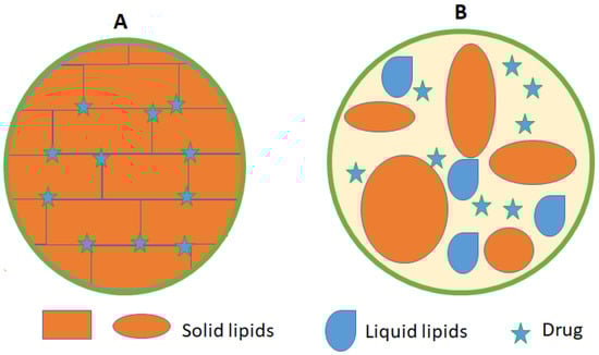 Schematic view of (A) SLN) and (B) NLCs showing the drug location within the lipid matrix.