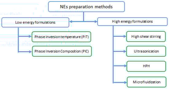 NEs preparation methods depend on the forming constituents and the scale-up requirements. NEs preparation methods are classified into high energy and low energy methods (Figure 5). High shear stirring, ultrasonic emulsification, and high pressure homogenization are examples of high energy methods [100]. In addition to the phase inversion temperature method (PIT), the Phase Inversion Composition (PIC) and spontaneous emulsification are the most common low energy methods [101].