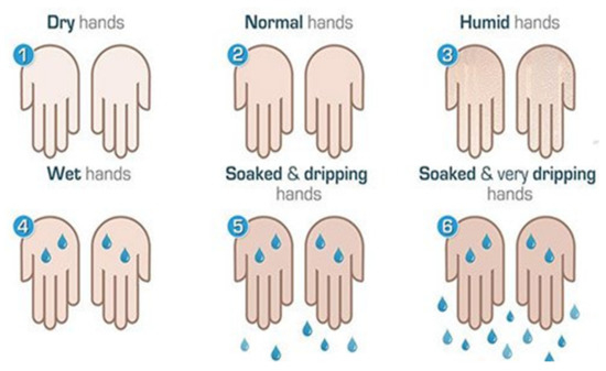 Disease severity was also determined by objective evaluation: the hands were dried and re-produced sweat was then observed. Sweating severity was evaluated using a 6-point visual scale [18] as shown in (Figure 1) to determine the amount of sweat produced.