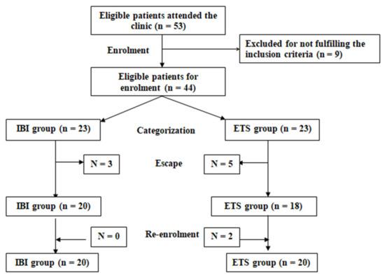Among the IBI group, four (20%) patients improved by 50% and three (15%) patients improved by 80% at the 2nd week of follow-up, and their improvement was maintained until the 12-week of follow-up. Another five (25%) patients were improved by 80% at the 4th week of follow-up, and their improvement was maintained until the end of the follow-up. The remaining eight patients showed 1–2 point improvements on the HDSS scale, but they later worsened, despite a final improvement by 50% in comparison to the initial pre-injection scorings. For the ETS group, at the 2nd week of follow-up, four (20%) patients were improved by 50%, 14 (70%) patients were improved by 80%, but two (10%) patients showed no improvement. At the 4-week follow-up, two patients showed a 1-point regression, while the remaining 16 patients maintained their HDSS until the end of the follow-up period (Table 2).