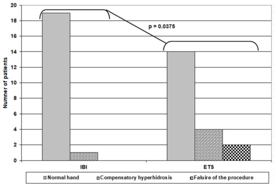 Objectively, the pre-IBI evaluation showed that four patients had soaked and very dripping hands, eight patients had soaked and dripping hands, six patients had soaked hands, and only two patients had wet hands. At the 2-week follow-up, 16 patients had normal hands, while three of those who had very dripping hands developed wet hands. At the 4-week follow-up, 19 patients had normal hands free of compensatory hyperhidrosis, and these evaluations were maintained until the end of the follow-up period, as assessed by Minor’s starch–iodine test. Only one patient still had soaked hands for a frequency of compensatory hyperhidrosis after IBI of 5%. For the patients who received ETS, four patients had soaked and very dripping hands, eight patients had soaked and dripping hands, and eight patients had soaked hands. At the 2-week follow-up, two patients showed no change, three patients had soaked hands, and 14 patients had normal hands, but unfortunately, one patient developed dry hands. These findings were continued up to 4 weeks postoperatively. Collectively, at the end of follow-up, only one patient in the IBI group had compensatory hyperhidrosis versus 6 patients in the ETS group; 4 had compensatory hyperhidrosis, and two had complete failure of the procedure (Table 4) (Figure 3).