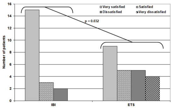 Regarding patients’ satisfaction, 24 patients were very satisfied with the outcome, eight patients were satisfied, four patients were dissatisfied, and four patients in the ETS group were very dissatisfied, with a significantly higher number of very satisfied patients in the IBI group (Table 5) (Figure 4).