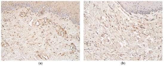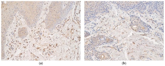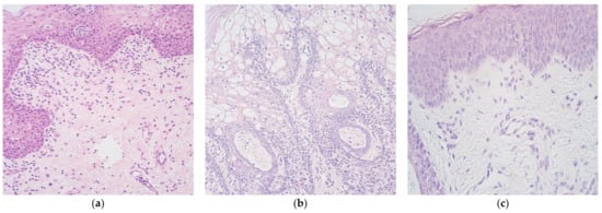 Routine haematoxylin and eosin staining showed patchy vacuolization of the lip epithelial cells (seborrheic keratosis) in 16 out of 20 cases, varying degrees of inflammation in 14 tissue samples, and basal cell hyperplasia in the epithelium of 9 tissue samples (Table 2, Figure 1a,b). Only one tissue sample and the controls did not show any of the above-mentioned signs (Table 2, Figure 1c).