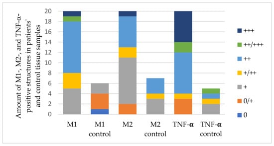 The distribution of M1-, M2-, and TNF-α-positive structures in patients’ group and control group tissue samples. Abbreviations: M1—phenotype 1 macrophages, M2—phenotype 2 macrophages, TNF-α—tumour necrosis factor alpha, 0—negative staining, 0/+—occasional positive structures, +—few positive structures, +/++—few to moderate immunoreactive structures, ++—moderate number of positive structures, ++/+++—moderate to numerous positive structures, +++—numerous positive structures in the visual field.
