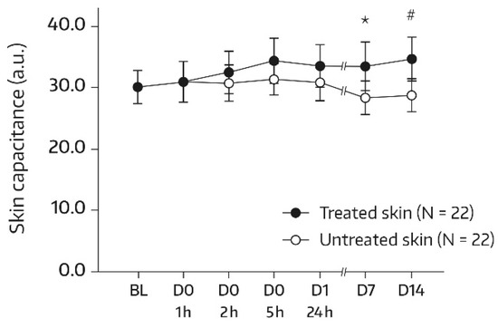 Results from skin capacitance measurements (forearm) in untreated skin and skin undergoing a single application of the face wash gel (first 24 h) followed by twice-daily applications for 13 days. The values were determined using corneometry and are presented as mean ± SD. BL—baseline skin capacitance value before the first product application; D—day; h—hour. * p = 0.026 if compared to the untreated control, as measured using a paired t-test. # p = 0.010 if compared to the untreated control, as measured using a paired t-test.