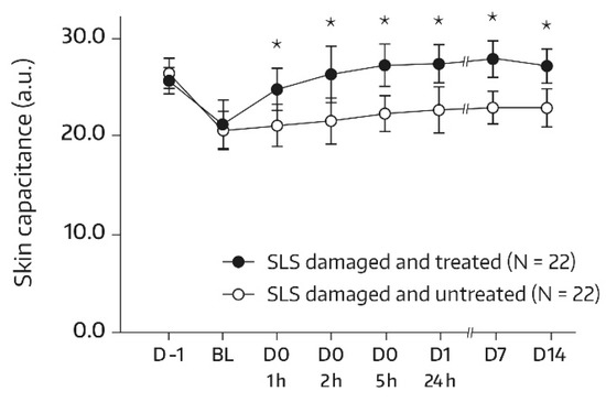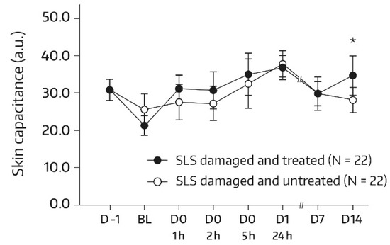 Results from skin capacitance measurements (forearm) in untreated SLS-damaged skin and SLS-damaged skin undergoing a single application of the face wash gel (first 24 h) followed by twice-daily applications for 13 days. The values were determined using corneometry and are presented as mean ± SD. The SLS challenge started on day -1 and stopped 24 h later (30 min before the BL assessment). BL—baseline skin capacitance value before the first product application; D—day; h—hour; SLS—sodium lauryl sulfate. * p = 0.039 if compared to untreated control, as measured using a paired t-test.