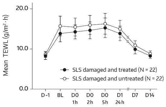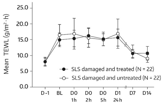 Results from the TEWL measurements (forearm) in untreated SLS-damaged skin and SLS-damaged skin undergoing a single application of the body wash gel (first 24 h) followed by once-daily applications for 13 days. The values are presented as mean ± SD. The SLS challenge started on day -1 and stopped 24 h later (30 min before the BL assessment). BL—baseline TEWL value before the first product application; D—day; h—hour; SLS—sodium lauryl sulfate.