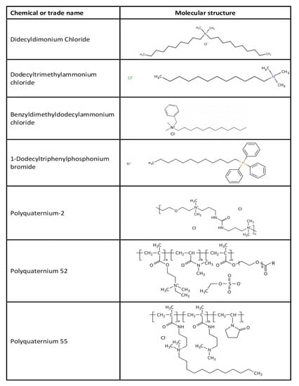 Some of the leading cationic antimicrobial surfactants are quaternary ammonium surfactants (QAS), which are amphiphilic molecules with a positively charged quaternary ammonium polar head group and one or two non-polar chains, usually n-alkyl, attached to it [14]. They can be used at a wide pH range which allows a great flexibility in formulations, with retention of the antimicrobial efficacy. Their microbiocidal activity has been established since the mid-1930s and during the past two decades there has been a dramatic increase in their use and their field of applications. Currently, QAS are used for various industrial purposes, including healthcare products, cleaning and disinfecting farm buildings, water and waste-water treatment, antifungal treatment in agriculture and in pharmaceutical products [15,16,17]. In cosmetics, QAS such as benzethonium chloride, stearalkonium chloride and cetrimonium chloride/bromide (cetrimide) have been utilized in facial cleansers, acne treatment, sun protection creams and lotions, moisturizers, hair conditioners, hair color and styling products [16,17].
