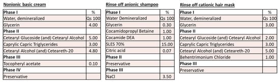 The susceptibility of the microorganisms to 0.5% of EHG/Phenoxyethanol/DDAC blend in three different cosmetic formulations—anionic surfactant-based shampoo, cationic surfactants-based hair mask and nonionic surfactants-based cream—is shown in Table 6. The formulation description of each cosmetic product is shown in Figure 2.