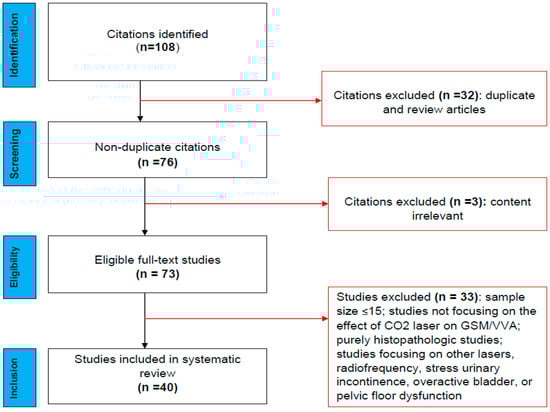 The flow chart of study selection is shown in Figure 1. Forty studies with a total of 3466 participants were eligible [,,,,,,,,,,,,,,,,,,,,,,,,,,,,,,,,,,,,,,,]. Major characteristics and outcomes of the eligible studies are shown in Table 1. The studies are randomized clinical trials (RCTs) (n = 5) [,,,,], prospective cohort (n = 26), retrospective (n = 8), and case series (n = 1). High quality (level II) evidence was included in 26 studies [,,,,,,,,,,,,,,,,,,,,,,,,,]. Eight studies included level III evidence [,,,,,,,]. In a handful of studies FrCO2 was compared to vaginal estrogen cream and/or vaginal lubricant [,,]. Seven studies included breast cancer survivors (BCS) [,,,,,,]. Only 4 studies evaluated the aesthetic outcome of CO2 laser therapy on GSM patients [,,,]. Up to 3 sessions 4–6 weeks apart were performed. Twenty-eight studies (70%) included ≤6 months follow-up and only 11 studies (27.5%) included ≥12 months follow-up.