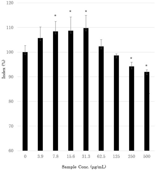 The MTT assay was used to evaluate the effect of AOH on the proliferation of NHEK cells. NHEK cells were treated with AOH (0 to 500 μg/mL) and incubated at 37 °C for 48 h. As shown in Figure 3, AOH showed a significant increase in cell viability at concentrations of 7.8–31.3 μg/mL.
