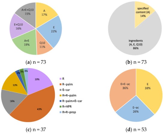 Distribution of the tested cosmetic products according to: (a) the labeled vitamins A and E and coenzyme Q10; (b) the quantitative specification of their content; (c) labeled vitamin A forms; (d) labeled vitamin E forms; n—number of the cosmetic products within each category.