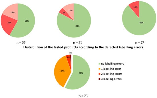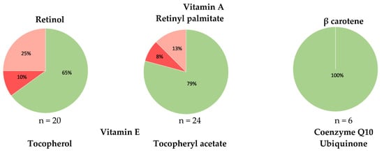 Accuracy of the labelling of vitamins A and E and coenzyme Q10 in the tested cosmetics (green—labelled and contained; pink—contained and not labelled; red—labelled and not contained) and the distribution of the tested products according to the detected labelling errors; n—number of tested cosmetic products within each category; labelling errors include the absence of the labelled (form of) compound and presence of a compound (in a form) which is not labelled.