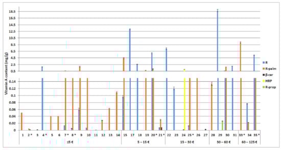 Determined content of retinol (R), retinyl palmitate (R-palm), β carotene (β-car), hydroxypinacolone retinoate (HRP), and retinyl propionate (R-prop) in the tested cosmetics (1–35), expressed in mg per g of the cosmetic product (average ± SEM, n = 3) in relation to the product’s price (per 50 mL). In the tested cosmetics numbered 16 and 33, the labelled vitamin A was not detected. In the tested cosmetics marked with *, a labelling error was observed.