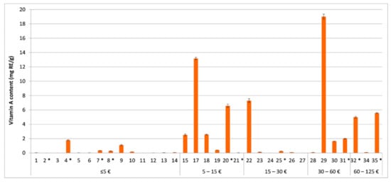 Determined total retinoid content, expressed in mg of retinol equivalents (RE) per g of the tested cosmetics (1–35) in relation to the product’s price (per 50 mL). In the tested cosmetics numbered 16 and 33, the labelled vitamin A was not detected. In the tested cosmetics marked with *, a labelling error was observed.